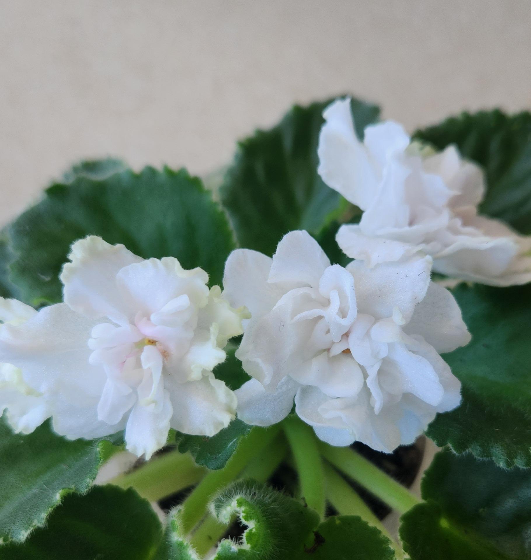(Фиалковод / А.Тарасов) Крупные густомахровые белые волнистые звезды с розовым глазком и зеленой каймой, подвернутой внутрь. Средне-зеленые зубчатые листья с белой окаймляющей пестролистностью. Ровная розетка. НОВИНКА КАТАЛОГА
